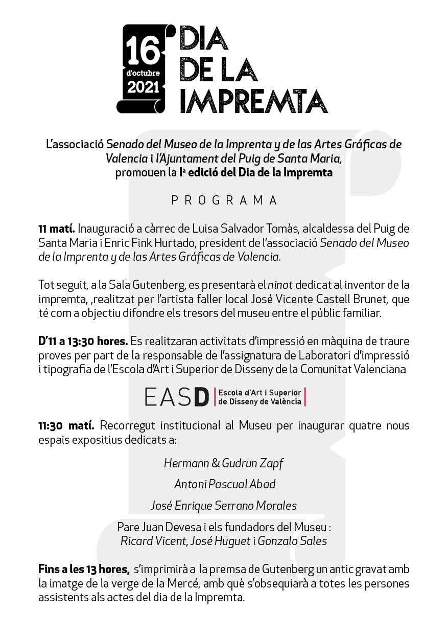 El sábado 16 de octubre la EASD València participó, a través del Laboratorio de Impresión y Tipografía -Taller de Letterpress- en colaboración con La Asociación Senado del Museo de La Imprenta y de las Artes Gráficas de València y el Ajuntament de El Puig, en diversas actividades  de impresión a máquina coordinadas por la profesora y responsable de la asignatura del Taller de Letterpress, Chus Martínez.