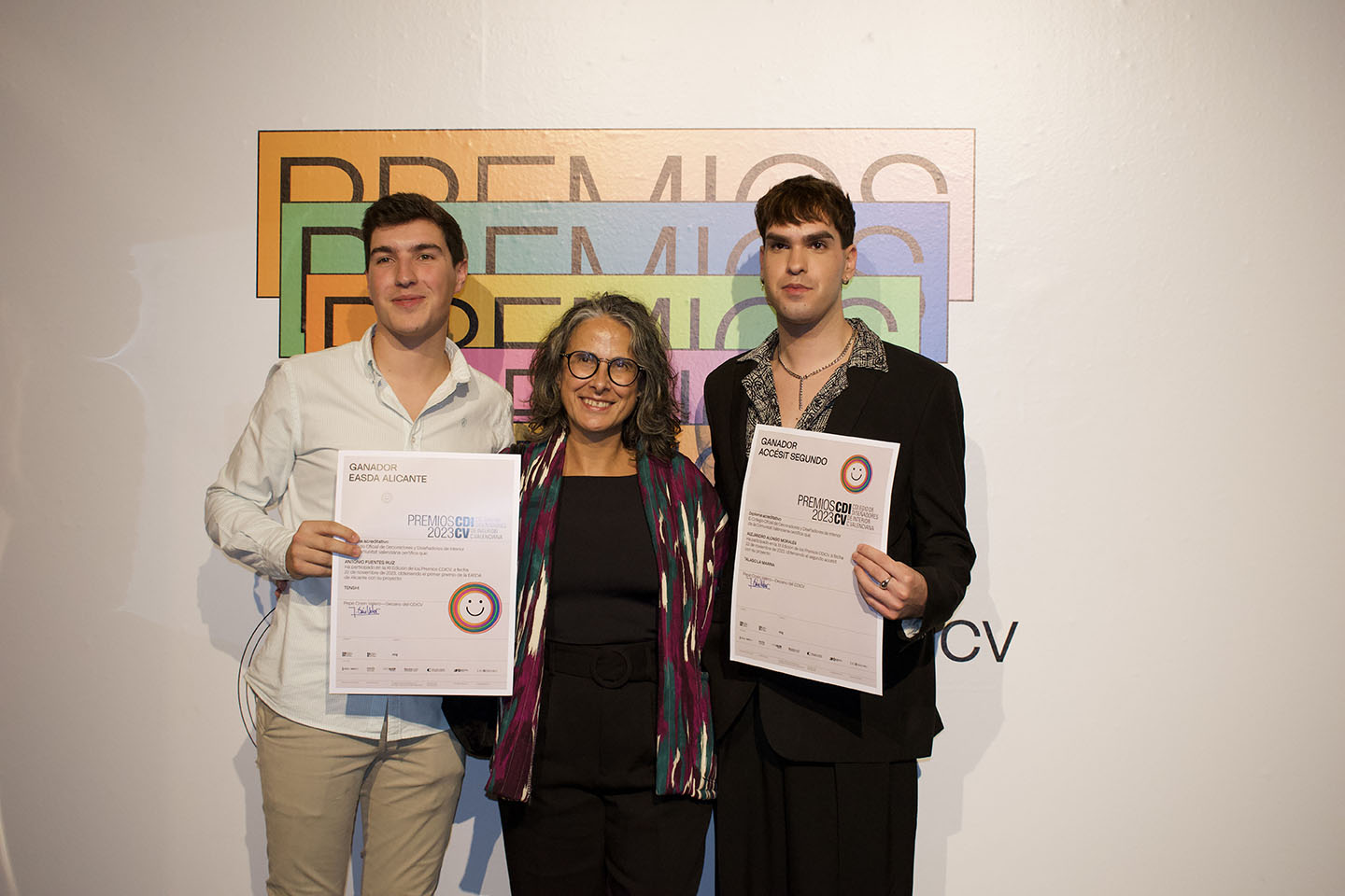 Antonio Fuentes, mejor proyecto de EASDA, Esther Castellón, profesora de diseño de interiores y Alejandro Alonso, segundo accésit