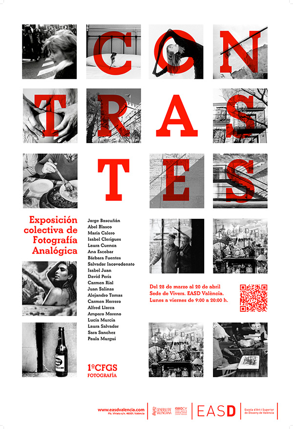 El martes 27 de marzo, en la EASD València, sede Vivers, inauguramos la exposición «Contrastes» -exposición colectiva de fotografía analógica- comisariada por las profesoras Eva López y Ana Mª Delgado, compuesta por los trabajos analógicos realizados por los alumnos de 1º del CFGS Fotografía, en la asignatura «Proyectos de Fotografía». La inauguración será a las 19 h en la sala Vivers, la muestra permanecerá abierta del 27 de marzo al 20 de abril.